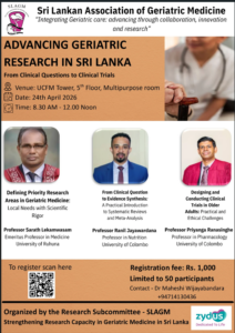 JOIN THIS EVENT Start April 24, 2026 - 12:00 am End April 24, 2026 - 12:00 am Address Sri Lanka Association of Geriatric Medicine View map + GOOGLE CALENDAR + ICAL IMPORT MORE DETAIL Website https://slagm.lk Phone +94714130436 Email slagm2014@gmail.com More Details Related Events ‘Therapeutics of Advanced Chronic Liver Disease – An Update’ by Professor Anuradha Dassanayake. March 20, 2022 5:00 pm 12th Anniversary Annual Academic Sessions 2026 June 11, 2026 12:00 am